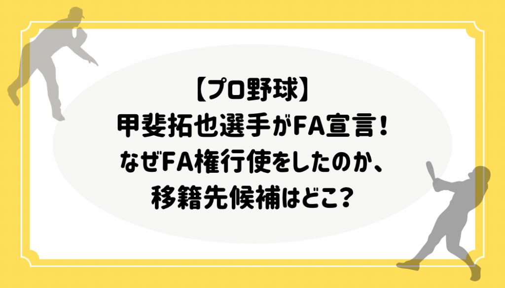 福岡ソフトバンクホークスにて長年活躍し、日本代表のキャッチャーとしても活躍していた甲斐拓也選手がFA宣言することになりました。 ソフトバンクでは出場機会も多くあり、地元も九州出身であるのにも関わらず、なぜ甲斐拓也選手はFA権を行使したのか気に... -